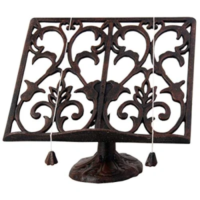 Esschert Design cast-iron cookbook stand provides the perfect resting spot for any cookbook while keeping it open to exactly the page you need Practical and beautiful; an item you will want to proudly display This traditional Victorian cast-iron cookbook holder with an antique rust finish will be an elegant addition to your kitchen counter Just lay your book on this sturdy stand, and the weighted page holders will keep your pages laying flat and easy to read Measures 10-7/10 by 5-1/2 by 9 inches