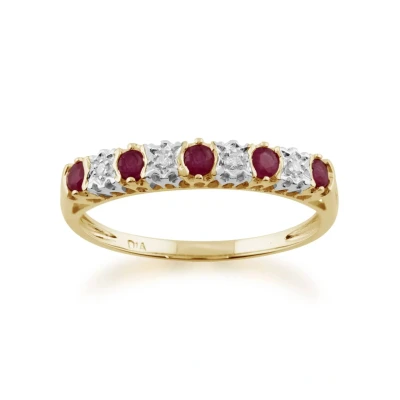 A beautiful ruby and diamond ring with a traditional 9ct yellow gold band. Wear this ruby eternity band as a symbol of love and passion. Gemstone Information Ruby gems are classed as one of four truly precious stones for their beauty and rarity.Ruby is the July birthstone and is often shared as 15th anniversary gifts. Jewellery Collection Discover Gemondo's classic jewellery with a range of timeless designs set with natural gemstones. Find elegant gemstone rings and occasion jewellery pieces that never go out of style. Product Code 11212 Dimensions Width - 3mmHeight - 3.5mm Material 9ct Yellow Gold 375 Hallmarked Gemstone Details 5 x Ruby - 0.31ct - Round Cut - 2.2mm4 x Diamond - 0.02ct - Round Cut - 1mm Gemstone Country of Origin Ruby - ThailandDiamond - India