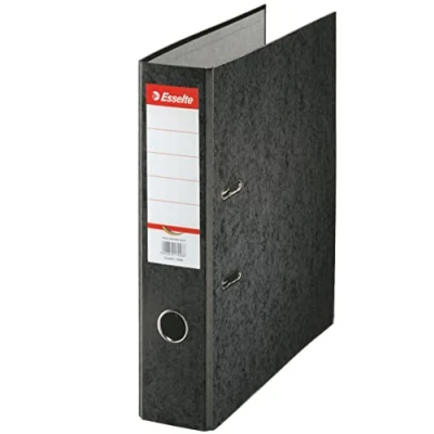 1 x Black Card File Folder for Daily Use Home or Office Capacity 500 Sheets (80 gsm) Label on the back, personalised and printable labels with Easyprint on the homepage Esselte Standard lever mechanism, keeps the folder closed and standing on the shelf by locking claws Easy to use thanks to handle eyelet, lid made of moire paper, grey interior, metal reinforcements, FSC certified Contents: 1 x corrugated cardboard lever arch file, cover made of moire paper in black and grey paper inside, 17929, dimensions H x D: 318 x 287 mm, A4, for standard punched holes with 2 holes