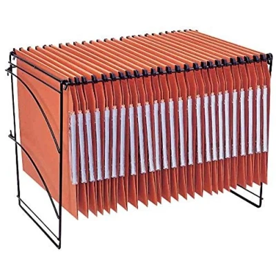Rack to store suspension files supplied with 25 suspension files Suspension files linking system joins files together to prevents paper loss Label holder with exchangable labels for content description Durable wire metal bar Made of 100 % recycled card, Blue Angel