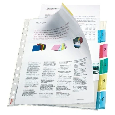 Punched pocket with 6 index tabs, Transparent and tear resistant, Easy organisation and storage of documents in files and binders, Holds up to 30 A4 sheets, Top opening Embossed finish prevents fingerprints or grease marks, Water resistant, Fits perfectly in files and folders and does not overhang Universal reinforced punched filing strip for easy filing in most types of binders and files, Coloured index tabs for easy identification Tear resistant due to material thickness and heat sealed edges, Copy-safe material for preventing text lifting from paper to plastic Contents: 1x Esselte Index Pocket with 6 tabs, A4, Dimensions (WxHxD): 250 x 320 x 1mm, Made of 130 micron PP material, 414160