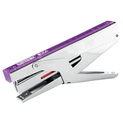Heavy duty metal stapling pliers, for home and school use; staples up to 15 sheets of paper (80gsm) at once; finished in a fresh and modern Colour'Breeze design Ideal for use at school, in the office or at home, for stapling and organising A4 and A3 papers, card, documents and other paperwork, and the pliers are compatible with Bébé staples and 8/4, with a 50mm insertion depth for flexible stapling Strong, durable manual hand stapler design with staples included; automatic staple feeder return action makes it quick and easy to re-load staples in the convenient top loading refill mechanism Made from metal working parts with bright finish for easy, fast and accurate stapling, the pliers include a 2 year guarantee when using Rapid staples Contents: 1 x Esselte Rapid Stapling Pliers, Includes 1000 Staples, Dimensions (W x H x D): 17 x 73 x 156 mm, 230g, Lavender, Colour'Breeze Range, 5001545