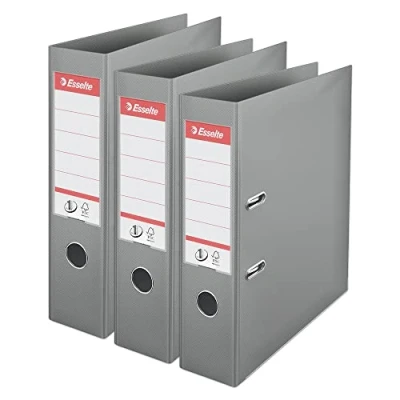 High quality lever arch file with strong No.1 mechanism, fresh colours, holds 500 sheets (80 gsm paper), ideal for home or office use Patented No.1 mechanism with outstanding locking force, perfect alignment of pins even when the folder is full, rado slots to secure the file when closed and upright, reinforced metal edge for stable storage Durable scratch resistent PP cover in fresh colours, spine pocket allows easy replacement of labels - additional labels can be printed using the EasyPrint custom label template available on the Esselte website A4 ring binder made from recycled cardboard, FSC certified, 3 year guarantee on the mechanism Content: 3 x Esselte lever arch file, Grey, 624284, single product dimensions: W x H x D: 72 x 318 x 288 mm, 450 g, for standard two hole punching