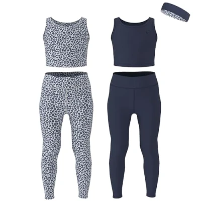 5-PIECE GIRLS ATHLETIC SET: This 5-piece girls athletic clothing sets includes (2) sleeveless cropped tank tops, (2) pairs of girls athletic leggings and (1) reversible headbands for kids in sizes 3-16. The girls tank tops provide freedom of movement, while the yoga pants offer comfort and support for active girls, whether it's yoga class, dance practice, or simply lounging at home LIGHTWEIGHT & BREATHABLE: Crafted from a premium-quality fabric blend of 85% nylon and 15% spandex with a 4- way stretch for a full range of motion. Whether running, dancing, bending, stretching, or jumping, kids can move with ease and comfort. MOISTURE WICKING MATERIAL: The moisture-wicking technology in Essenclo Girls' athletic clothing keeps ensures durability and breathability to kids cool and dry no matter the activity. The fabric wicks away moisture, keeping kids dry and comfortable perfect for dance practice, cheer, yoga class, gymnastics, and everyday wear. EASY-CARE & MACHINE WASHABLE: Machine washable and quick-drying, these pieces are designed to withstand frequent washes and maintain their shape and color over time. STYLISH DESIGNS: With a trendy cropped length and vibrant colors, our tank tops add a fashionable touch to any outfit. Paired with the 1 reversible headbands and matching leggings, kids can express their unique sense of style while staying active. For Sizing refer to our detailed size chart available in the image section.