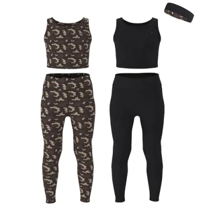 5-PIECE GIRLS ATHLETIC SET: This 5-piece girls athletic clothing sets includes (2) sleeveless cropped tank tops, (2) pairs of girls athletic leggings and (1) reversible headbands for kids in sizes 3-16. The girls tank tops provide freedom of movement, while the yoga pants offer comfort and support for active girls, whether it's yoga class, dance practice, or simply lounging at home LIGHTWEIGHT & BREATHABLE: Crafted from a premium-quality fabric blend of 85% nylon and 15% spandex with a 4- way stretch for a full range of motion. Whether running, dancing, bending, stretching, or jumping, kids can move with ease and comfort. MOISTURE WICKING MATERIAL: The moisture-wicking technology in Essenclo Girls' athletic clothing keeps ensures durability and breathability to kids cool and dry no matter the activity. The fabric wicks away moisture, keeping kids dry and comfortable perfect for dance practice, cheer, yoga class, gymnastics, and everyday wear. EASY-CARE & MACHINE WASHABLE: Machine washable and quick-drying, these pieces are designed to withstand frequent washes and maintain their shape and color over time. STYLISH DESIGNS: With a trendy cropped length and vibrant colors, our tank tops add a fashionable touch to any outfit. Paired with the 1 reversible headbands and matching leggings, kids can express their unique sense of style while staying active. For Sizing refer to our detailed size chart available in the image section.