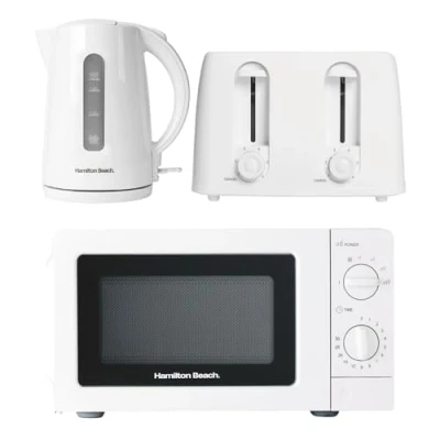 AmazonComplete White Kitchen Set: Includes 20L 700W white microwave, 1.7L rapid boil kettle and 4-slice toaster – perfect for new homes, students and modern kitchens. 20L 700W Standard Microwave (White): Manual controls, 6 power levels, speedy defrost function, 30-min timer and compact design for small worktops. 1.7L Essential Rapid Boil Kettle: 3000W fast boil, auto shut-off, boil-dry protection, button-release lid, illuminated switch and water level window. 4-Slice Essential Toaster (White): Wide slots with 6 browning levels, defrost and cancel functions; removable crumb tray and integrated cord storage. Clean White Modern Style: Matching white microwave, kettle and toaster for a fresh, minimalist look that suits classic, contemporary or Scandinavian kitchens., Weight: 33.0693393 Pounds, Manufacturer: Hamilton Beach