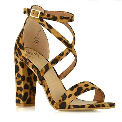 ESSEX GLAM Womens Ankle Strap Block Heel Sandals Ladies Strappy Buckle Prom Party Shoes Size 3 8 (UK / EU 36 US 5, Leopard Faux Suede)