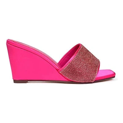 ESSEX GLAM Womens Diamante Low Wedge Heels Ladies Sparkly Square Toe Fuchsia Slip On Mules Size 6