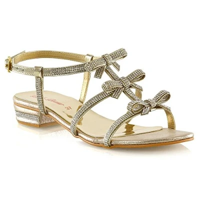 ESSEX GLAM Womens Flat Strappy Sandals Diamante Bow Ladies Party Holiday Sparkly Heel Shoes Gold