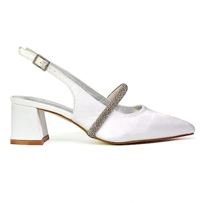 ESSEX GLAM Womens Low Heel Bridal Shoes Ladies Pull On Slingback Diamante Strap White Wedding Party Pointed Toe Courts Pumps Size 8