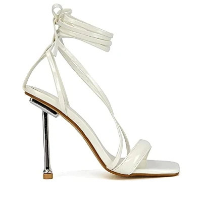 ESSEX GLAM Womens Stiletto High Heel Sandals Ladies Strappy Ankle Lace Up Square Toe Party Shoes Size 3 8 White Patent