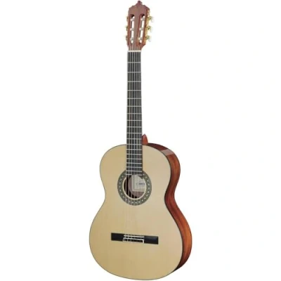 Model: Estudiante XA Scale: 65 cm, neck width at saddle: 50 mm, top: spruce, back and sides: mahogany Binding: Black, Strings: Royal Classics Preludio, Neck: Mahogany, Fingerboard: Black Walnut Bridge: black walnut, with double bore, saddle and bridge: bone Mechanics: gold, finish: high-gloss natural