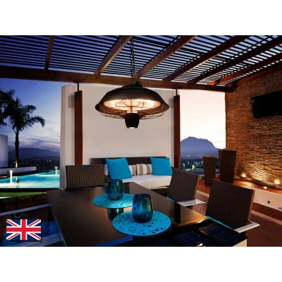 Electrical heater for ceiling installation, suspension style. Made of metal and plastic, black finish. 600/900/1500W halogen heating. 1W LED light. Remote control. Cable: 1.8 m. IP44. G plug type (UK).