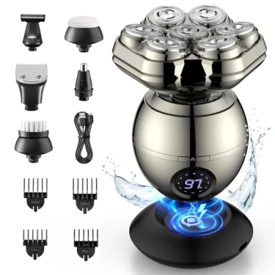 【Precision Blades Cutting System】 Our head shavers is professionally tested with skin-friendly and durable double ring mesh blades, the blades are made of ultra-thin alloy material for a sharper and safer shave. The 7D floating cutter head increases the shaving area and fits the face and head contour better, It provides you with a more fitting and smooth shaving experience. It is suitable for all hair type 【New Removable Magnetic Head】The head shavers for bald men features a magnetic suction structure, allowing you to effortlessly detach the entire head in one go, making it easy to clean trapped hair in just 2 simple steps. Save your valuable time and enjoy life to the fullest 【6 in 1 Razor Gift Kit】The electric razor for men includes 6 detachable accessories: 7D Magnetic Shaver, Nose/Ear Hair Trimmer, Hair Trimmer (3/6/9/12mm), Facial Massage Brush, Facial Cleaning Brush, Body Trimmer and Sideburn Trimmer. This professional 6-in-1 Grooming Kit shaving kit for men fulfills all your personal facial shaving needs for beard and hair. All the heads of our beard trimmer feature skin-friendly and durables blades 【Convenient to Carry】This bald head shavers for men is ergonomically designed, it has both a sense of grip and beauty, there is no paint process on metal surface, make the mens shaver more durables and not easy to be broken. The shavers for men is lightweight and portable, easy to put in a backpack or suitcase, will meet your shaving needs anytime, anywhere. It is also a choice to send to father, boyfriend, husband or son on Christmas, birthday and other holidays Wireless & USB C Charging & LED Display】The electric shavers supports wireless and various USB devices for charging.2 hours of fast charging can provide 90 minutes of working time. The electric shaver for men features an LED display that allows you to easily check the battery level. It is durable, sustainable, energy-saving, and cost-effective. NOTE: Make sure to recharge the head shaver before the first-time use