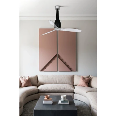 The sleek Matt Black finish of the Eterfan ceiling fan allows it to blend seamlessly into a variety of interior decors, making it an ideal fit for contemporary settings. The fan features clear glass elements, contributing to its elegant design. For those wishing to personalize their fan further, there is an option to customize the color; potential buyers are encouraged to contact for details on availability and options.