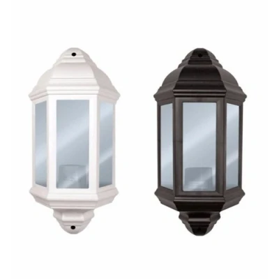 The Eterna 60 Watt Half lantern is the ideal outdoor porch lighting solution for those who wish to show clean and traditional styling around their home. This stylish model features durable Polycarbonate construction, with high corrosion resistance, and an IP44 rating, which makes it suitable for general outdoor use. This unit is fitted with a one piece lens to ensure quick and easy assembly. this unit comes in two finishes, Black or White. The max fitting for this lantern is 60W ES lamp, but also accepts suitable low energy lamps. Main Features: Ideal for External use Traditionally styled Recessed effect White or black finishes ES 60W max bulbs accepted Technical Specifications: Weatherproof: IP44 Voltage: 230V ~ 50 Hz Wattage: Fitting is rated at 60W max Dimensions: 360mmx163mmx100mm Specification Sheet 1 Year Warranty Included
