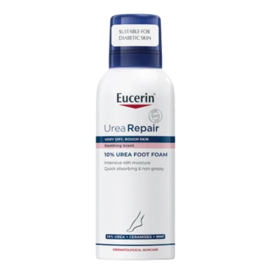 "You'll love the convenience of Eucerin's new Urea Repair Plus 10% Urea Foot Foam - a frothy formula that provides instant comfort to dry, cracked heels needing deep moisturisation." - Keavy, Escentual Beauty Team.. Why You'll Love The Eucerin's new Urea Repair Plus 10% Urea Foot Foam:. A fast-drying formula for cracked feet and heels suitable for those with xerosis, psoriasis and diabetes.. 95% of diabetic users rated the perfumed foam's texture and consistency just right, while 94% confirmed the overall effectiveness of the foam for their dry skin.. Provides 48 hours of immediate dry skin relief.. Smooth cracks and softens tough skin.. Protects feet against fungal infections.. What You Need To Know:. The Urea Repair Foam will exfoliate while moisturising with 10 % urea and preventing fungal infection thanks to decanediol. Ceramides will strengthen your dry, thickened heels to ensure no moisture loss while softening skin with natural moisturising factors to reduce the chance of additional cracking and dryness.. Why It's Escentual:. If you're already a fan of the Eucerin Urea Repair Plus 10% Urea Foot Cream but find it too greasy and overburdening for daily use, you'll love the new Urea Repair Foam. The white foam formula is whipped and weightless on the skin, with a slight chemical scent so subtle you'll barely notice it. It has a much fresher, quicker drying formula, which means you can easily apply it before heading out for the day.. It comes in a metal bottle with a navy lid in the best-selling line's signature colours.. The Best Way To Use It:. Shake the bottle well. Hold it upright and press to release the foam into the palm of your hand and smooth it all over the underside of your feet when needed. Avoid contact with eyes.. The Sustainable Side:. You can recycle the outer box.. Values:. Clinically-tested. Dermatologist-Tested.. Microplastics-free.