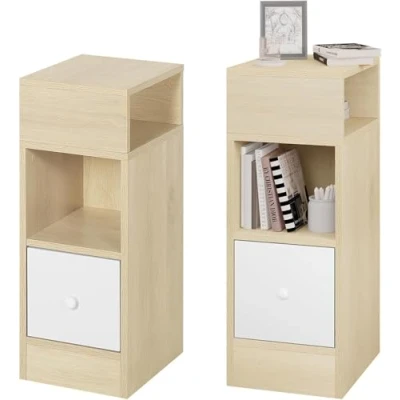 EUGAD Slim Bedside Table set of 2, Narrow Cabinet, with 2 Open Shelves 1 Drawer, 25 x 66 30 cm, nightstand for bedroom, Wood, Oak, 0192ZZ
