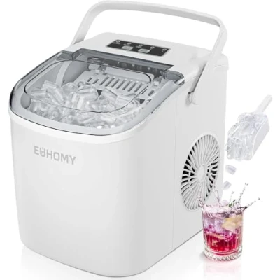 EUHOMY Compact Countertop Ice Maker 9 Cubes in 6 Mins, 2 Sizes, Self Cleaning, 12kg/day, White, Includes Scoop and Basket for Home/Kitchen/Office/Bar