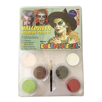 The Halloween make-up palette is enough for approx. 60 masks Included are 4 x 3.5 ml of the colours white, black, witch green and light red As well as a cake blood, an effect wax, a wax spatula, a brush and a guide poster The instructions poster comes with a complete step-by-step presentation so that you can easily recreate the respective motifs Other make-up colours, sets and accessories can be found in our brand shop. Click on the brand name Eulenspiegel below the product title