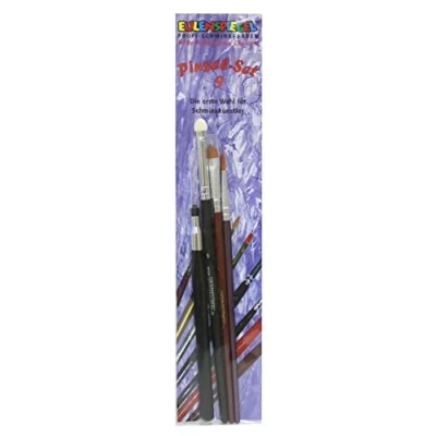 This is the professional brush set 9 from Eulenspiegel The set includes a pointer, an applicator brush, a round brush size 3 and a triangle brush size 4 Round brushes are all-rounders: suitable for large areas (depending on size), as well as for fine accents and highlights. Round brushes are very suitable for fine to thicker curved lines and flourishes and also for contour painting. Cat tongue brushes are ideal for make-up of lips or colouring Synthetic fibre brushes last much longer than natural hair brushes as they hardly bend and absorb less water than natural hair brushes Perfect for your make-up case, carnival, theme parties, Halloween or other events Set 9 Pack of 4 1 Applicator Brush 1 Triangle Brush Size 4 1 Round Brush size 3 First Choice for most body and face Painters, Manufacturer: Eulenspiegel