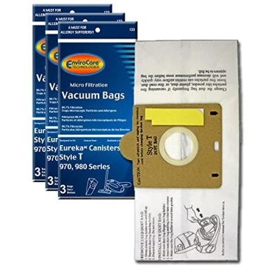 (9) Eureka Style T filter bags fit the Eureka 970 canister vacuum series. Allergen vacuum cleaner bags for canister using the Eureka Style T. 3-Packs of 3 Bags in each Pack Total of 9 Bags International products have separate terms, are sold from abroad and may differ from local products, including fit, age ratings, and language of product, labeling or instructions., Weight: 0.4629707502 pounds, Manufacturer: ENVIROCARE
