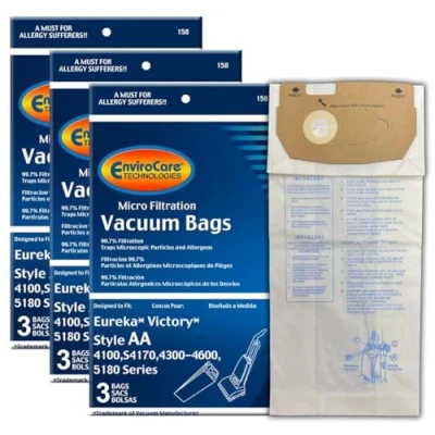 9 Eureka AA Bags made by Envirocare Technologies Micron filtration Allergy Bag Traps Bacteria, Dust Mites, etc.down to 0.1 micron Best for Allergy & Asthma Sufferers Fits EUREKA 4100, 4300-4600, 5180, S4170 Series Uprights. International products have separate terms, are sold from abroad and may differ from local products, including fit, age ratings, and language of product, labeling or instructions., Weight: 0.720625 pounds, Manufacturer: EnviroCare