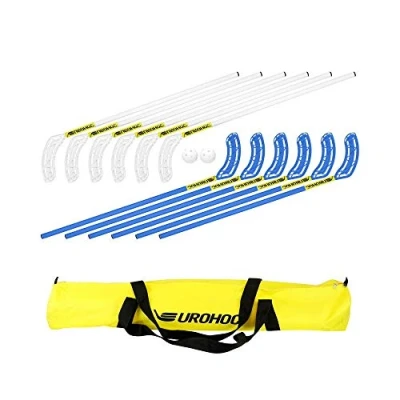 This high quality Eurohoc Floorball Club Set contains everything you need to enjoy an innovative game of Floorball 6 x Blue Sticks / 6 x White Sticks / 2 x Balls / 1 x Holdall / 1 x Rule Booklet Safe, easy to learn and emphasises movement and alertness, rather than strength or height The number of players vary to suit the size of the playing area available, whether on indoor surfaces or outdoors on tarmac or grass from 3 - 6 per side Sticks crafted from lightweight, high tensile plastic Shaft Diameter 25mm / Shaft Length 85cm - Total length of each stick 102cm