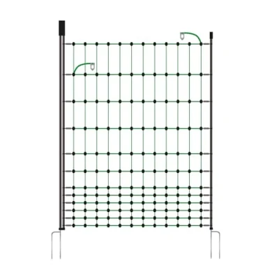 Original Gallagher Entry Gate for Electric Netting - 138 cm / 112 cm A practical gate for your pasture nets (sheep nets, poultry nets, goat nets). Quickly and easily create an electrified passage in your pasture net. The handle is insulated, so you don't have to switch off the electricity when you want to open the pasture fence gate. Matching connection clips at each end provide a reliable electrical connection between the gate and your existing electric net. This gate for electronic nets offers a passage width of approx. 120 cm. Assembly and installation on your existing electronic net is very simple and can be done without tools. Features * Easy to assemble * Height: 112 cm * Width: 138 cm * Passage width: 120 cm * Top strand 24 monofilaments 0.40 mm * 10 strands 15 monofilaments 0.40 mm + 3 stainless steel conductors 0.20 mm * Bottom strand 32 monofilaments 0.40 mm * Vertical strands 15 monofilaments 0.40 mm * Light weight and easy handling * Can be electrified * UV-stable