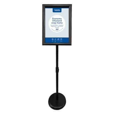 Europel Infostand Economy, Black A4 snap Frame 25mm, Portait or Landscape Orientation, Free Standing Display with Adjustable Height, for Posters, Signs, Advertising, menu, Shop, Hotel, Restaurant.