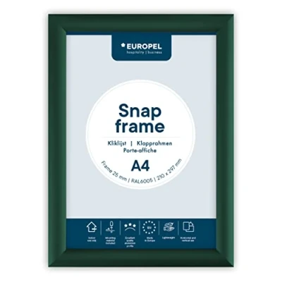 EUROPEL lightweight Snap frame A4, Green, Profile 25x11 mm, Anodized aluminum, anti reflective protector, External dimensions 241x328 Grey polystyrene back