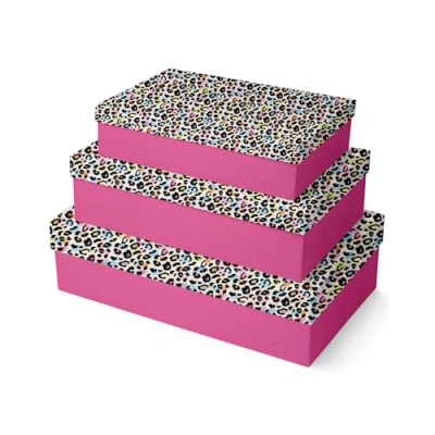 DESIGN: this set includes 3 trendy boxes: a leopard print on the lid and a pink box, modern and attractive designs for storage or decoration. MULTI-PURPOSE: a set of 3 stackable rectangular cardboard boxes for all your needs, perfect for organizing your home life. GIFT OR STORE: these boxes are ideal as gift boxes, but also for storage and decoration, holding office supplies, books and even underwear in a wardrobe. DIMENSIONS: discover a practical, functional format, with boxes that stack inside each other; Box 1: 35 x 26 x 7cm; Box 2: 37 x 28 x 9 cm; Box 3: 39 x 30 x 11 cm. CLAIREFONTAINE RHODIA is the specialist in gift wrapping paper: our quality products meet your needs and requirements! Our wide range of gift wrapping products will enhance your most beautiful gifts all year round.