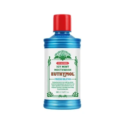Euthymol Mouthwash ICY Mint 500ml, Contains Flouride, Alcohol Free, Distinctive Strong Taste Flavour, Reduce Plaque Gingival Clean Healty Teeth Gums, Freshens Breath Refreshing Daily Oral Dental Care