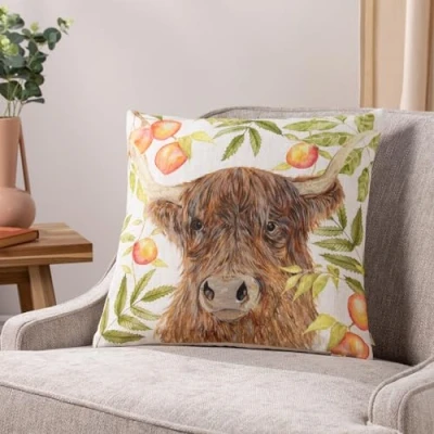 Featuring a hand-painted watercolour design of a Highland Cow about to nibble on the refreshing fruit in the orchard. Complete with a plain reverse, knife edge trim and zip fastening. Made using a 96% Polyester 4% Linen mix, this cushion is super soft yet durable. Designed, printed and made in the UK. Machine Washable (40 degrees max), Line Dry and Cool Iron Only.