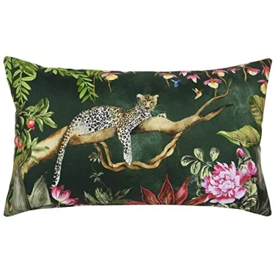 STRIKING LEOPARD DESIGN: Features a poised leopard amidst lush jungle foliage on a tonal forest background, adding wild charm to your outdoor space. COORDINATED REVERSE: Matching printed leaf design on the back with a discreet hidden zip for a polished, versatile finish. DURABLE AND WATER-RESISTANT: Made from tough polyester to withstand showers, spills, and outdoor living, keeping your cushion looking fresh. EASY CLEANING: Sponge clean only – perfect for busy outdoor areas without the hassle of complicated care. BRITISH DESIGN & QUALITY: Thoughtfully designed, printed, and made in the UK for a stylish and long-lasting outdoor accessory.