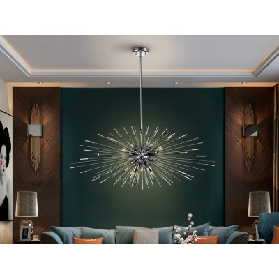 Spheroidal lamp made of chromed metal. Clear glass radial rods with endings decorated in dark chrome plated. Adjustable length. Dimmable.