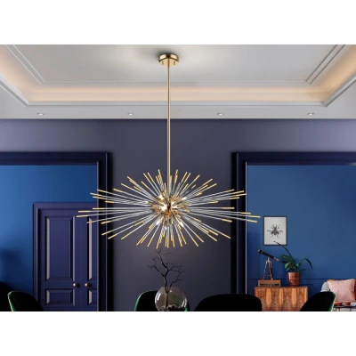Spheroidal lamp made of metal, finished in bright gold. Clear glass radial rods with endings decorated in amber. Adjustable length. Dimmable.