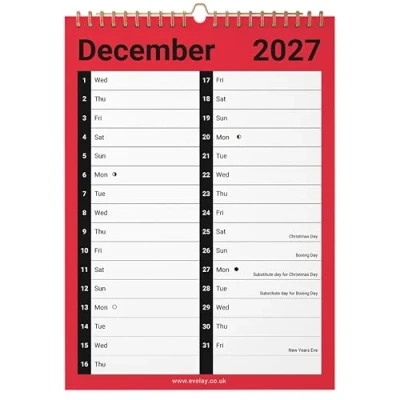 Two Column Design – Clear 2-column layout offers extra writing space for notes, schedules or splitting work and personal plans. Month to View Layout – One full month displayed on each page, making it easy to plan events, appointments and reminders at a glance. A4 Large Wall Planner – Generous A4 size provides excellent visibility, ideal for kitchens, home offices, workplaces or study areas. Quality 170gsm Paper – Printed on thick 170gsm paper for smooth writing and reduced ink bleed-through. Full Year Coverage – Runs from January 2027 to December 2027, keeping you organised all year round.