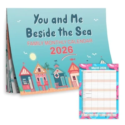 Seaside Family Planner - Month to view layout with calming coastal and beach-themed designs for 2026. 5 Useful Columns - Space for each family member plus notes. Ideal for tracking appointments, chores, activities and schedules. A3 Size When Hanging - Opens to A3 (30.5 × 28.5 cm) for clear visibility in kitchens, hallways, offices or classrooms. Quality 170gsm Silk Paper - Durable, non-gloss finish for smooth writing and easy viewing under lights. Includes UK Dates & Holidays - Clearly marked bank holidays and notable UK events to help plan ahead effortlessly.