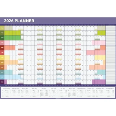 Full Year at a Glance – Displays the entire year from January 2026 to December 2026 on one clear, easy-to-read planner. Large A1 Size – Measures 84cm x 59cm, providing generous space for planning home, office, work, or family schedules. Clear Daily Boxes – Each day box measures approx. 20mm x 35mm, ideal for writing notes, reminders, and appointments. Quality Glossy Paper – Printed on durable 135g/m² glossy art paper for a smooth finish and vibrant clarity. Folded for Easy Delivery – Supplied folded down to A4 size for convenient postage and storage (pen not included).