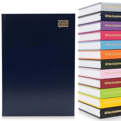 Page a Day Appointment Layout – One full A4 page per day, including Saturday and Sunday, ideal for detailed daily scheduling. Hourly Time Slots 9am to 5pm – Features 30-minute intervals to manage appointments, meetings, and time-based planning with ease. Large A4 Writing Space – Generous page size offers plenty of room for notes, reminders, and personal schedules. Hardback Cover with Ribbon Marker – Durable hardback finish with a built-in ribbon bookmark for quick page access. Extra Planning Information – Includes year planner plus useful reference pages such as time zones, international dialling codes, and currency charts.
