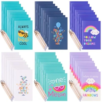 Pack of 48 notebooks A7 with ruled pages and 48 pencils with erasers. Fun, practical, and perfect for kids' creativity. A great party favour or gift for birthdays, school events, or celebrations. Easy to share and guaranteed to delight. Teachers can use them as fun and functional classroom prizes, rewards, or thank-you gifts for pupils. Each notebook measures 8cm x 12.5cm. Small enough for pockets or bags, ideal for writing, sketching, or doodling on the go. Features a variety of colourful covers to inspire kids. Adds cheer to treat boxes, stationery sets, or learning kits.