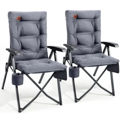 EVER ADVANCED Luxury Camping Chairs 2 Set for Adults Heavy Duty High Back Oversized Folding Garden Chair Comfy Padded 6cm Loadable 150kg Adjustable Dining 4 Position Recliner Grey