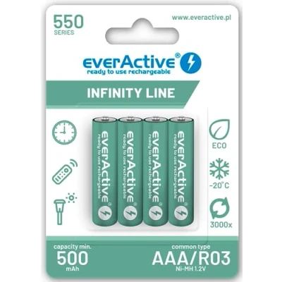 everActive Battery AAA 550 mAh 4 pieces, NI MH, Mini R03, rechargeable, pre charged, Infinity Line 1.2 V, 1 blister card, green, EVHRL03
