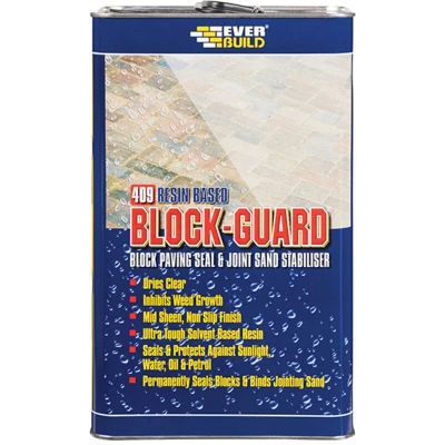 General description Everbuild 409 Block Guard is a long-lasting acrylic-based formula that dries clear. It is designed to bind jointing sand and form a durable seal over block paving and other mineral pavers or flags. The product penetrates deeply into pavers and jointing sand, curing through solvent evaporation, which helps facilitate easier cleaning. Additionally, it contains a powerful fungicide to prevent the growth of mould, fungus, or weeds. Technical specifications Size: 5 litre Coverage: Average 2m² per litre Drying Time: 3-4 hours between coats Type: Sealer MPN: BLOCKGUARD5 EAN: 5029347603083 Areas for use Block paved drives and pathways Natural stone patio areas Cement-based flagstones Other information