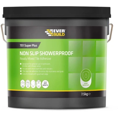 General description Everbuild 701 Acrylic Non Slip Tile Adhesive is a ready mixed buff adhesive paste designed for securing ceramic wall tiles and mosaics to most interior wall surfaces. This product features a blend of limestone fillers, clays, and acrylic polymers, ensuring excellent adhesion and non-slip characteristics. Technical specifications Size: 7.5kg Tub Type: Adhesive MPN: NS05 EAN: 5029347070137 Usage Apply straight from the tub for convenience. Ideal for kitchen and bathroom walls. Suitable for shower areas when used with Everbuild Powdered Wall Tile Grout. Other information