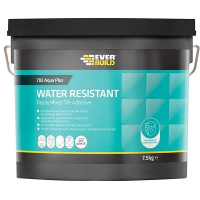 General description Everbuild 702 Water Resistant Tile Adhesive is a premium grade adhesive designed for use in areas exposed to prolonged or permanent wet conditions, as well as in high humidity and condensation environments. This ready-mixed formula allows for easy application directly from the tub, eliminating the need for mixing and reducing mess. Technical specifications Weight: 16 kg Volume: 10 Litres Type: Adhesive Manufacturer Part Number (MPN): RES10 EAN: 5029347070205 Tested to: EN 12004 type D2T Usage Ideal for kitchen and bathroom walls Suitable for shower areas when used with Everbuild Powdered Wall Tile Grout Applicable in communal and power showers Can be used on worktops subject to water contact Other information
