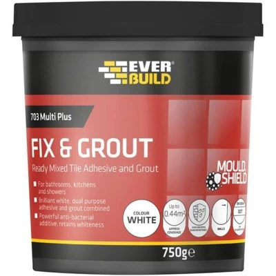 General description Everbuild 703 Fix & Grout Tile Adhesive is a premium grade adhesive formulated for use as both an adhesive and grout. It contains a fungicide to prevent mould growth and dries to a brilliant white finish, making it ideal for various applications. Technical specifications Weight: 1.5kg Type: Adhesive & Grout Tested to: EN 12004 type D2T Water resistance: Excellent Bond strength: Over double the B.S. minimum requirement in wet shear Areas for use Kitchen/Bathroom walls Shower areas Communal and power showers Worktops subject to water contact Usage Apply straight from the tub. The ready-mixed formula allows for easier application than most competitive adhesives, with an extended open time. Other information