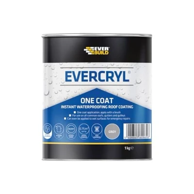 ManoManoGeneral description Everbuild EVERCRYL is a resin-based, fibre reinforced roof repair compound designed for effective use on all common roofing surfaces. It provides an instant roof repair even in wet conditions, allowing for immediate application during rain. This product can also be applied in frosty conditions down to -5°C and is instantly waterproof upon application, eliminating concerns about wash off. Technical specifications Colour: Grey Size: 1kg Type: Roof Repair MPN: EVCGY01 EAN: 5029347609658 Usage Everbuild EVERCRYL One Coat is suitable for various applications, including: General sealing, maintenance, repair, and waterproofing of most common roofs in both wet and dry conditions. Effective on surfaces such as concrete, fibre/cement, roofing felt, mastic asphalt, existing bituminous roof coatings, rigid PVCu, corrugated iron, metals, slates, brickwork, tiles, lead, copper, and zinc. Waterproofing guttering (plastic and metal), downpipes, gullies, flashings, upstands, vents,