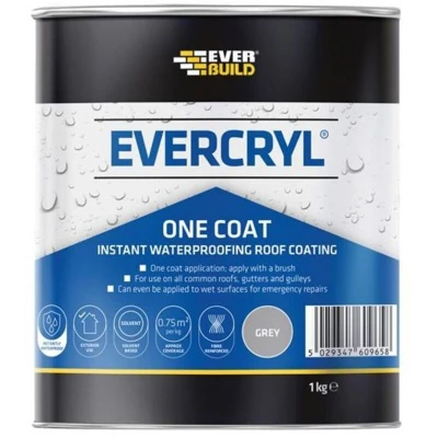 Whether you are a homeowner or a professional roofer, Everbuild Evercryl One Coat is the perfect solution to tackle roof repairs effectively and efficiently. A grey, resin-based, fibre-reinforced roof repair compound designed to be effective on all common roofing surfaces and types, it is an excellent solution for roof repairs, even in wet conditions, ensuring a robust and long-lasting fix. Able to adhere without the need for a primer on sound non-porous surfaces, Evercryl will save you time and effort on every job.Evercryl One Coat is specially formulated to be applied even in wet or frosty conditions down to -5C, ensuring you can address emergency leaks immediately without waiting for the rain to stop. When applied, it becomes instantly waterproof, eliminating the risk of wash-off. Easy to use and highly effective, this product can be brush applied and dries to form a smooth, seamless, and flexible membrane. The added benefit of resistance against algae and fungal growth ensures the longevity of your roof repair, even in damp environments.Features & Benefits: Everbuild Evercryl One Coat Grey Roof Waterproofer - 1kg 0.75m2, No primer is needed on sound non-porous surfaces, saving you time and effort, Can be applied in wet or frosty conditions down to -5C for immediate leak repair, Easily brush applied and dries to a smooth, flexible membrane, instantly waterproof, preventing wash off during applicationEvercryl One Coat's high level of fibre reinforcement allows it to bridge small cracks, providing comprehensive water protection with just a single coat application. Rest assured that your roof will be shielded from potential leaks, even in areas prone to ponding.. Everbuild Evercryl One Coat Grey Roof Waterproofer - 1kg | 0.75m2